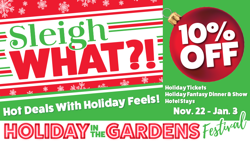 Holiday in the Gardens Sale! Save 10% on Holiday Tickets, Holiday Show, and Hotel Stays Celebrate the season with big savings! For a limited time, enjoy 10% off tickets, hotel stays, and Holiday Show tickets for Holiday in the Gardens, the Gulf Coast’s largest holiday celebration.