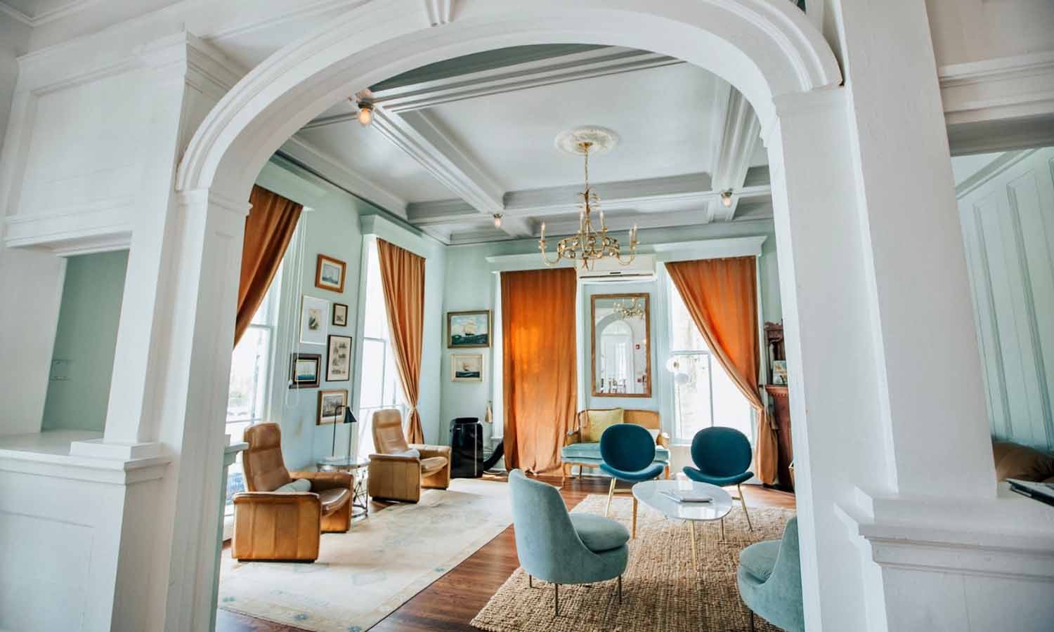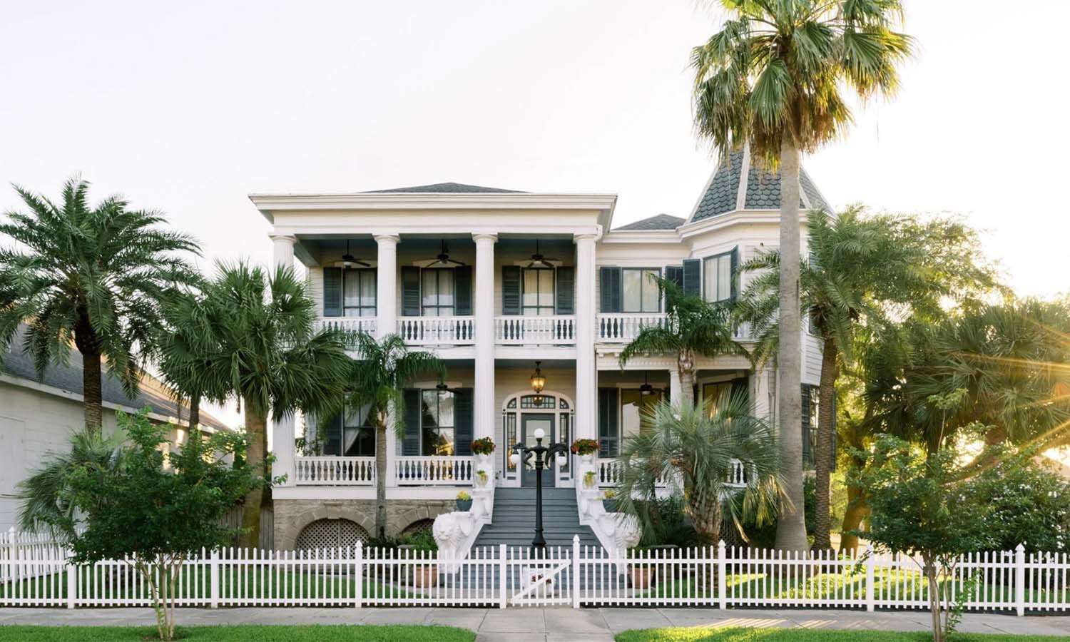 A restored 19th-century Greek Revival estate offering boutique rooms and gathering space in Galveston's East End.