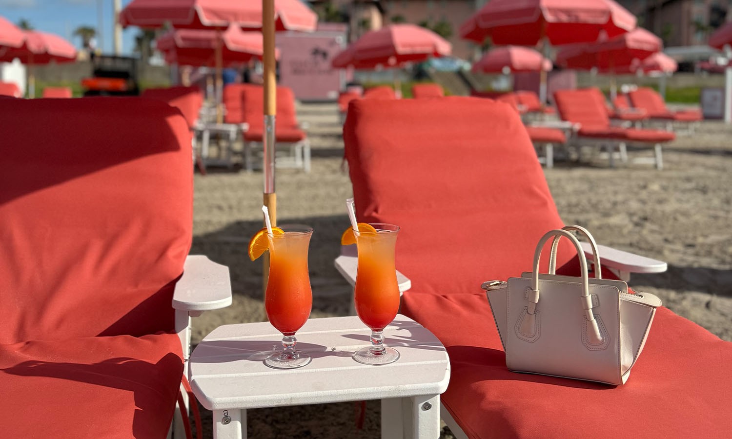 - Pink Pillow-topped chaise lounges, striped towels, and large umbrellas