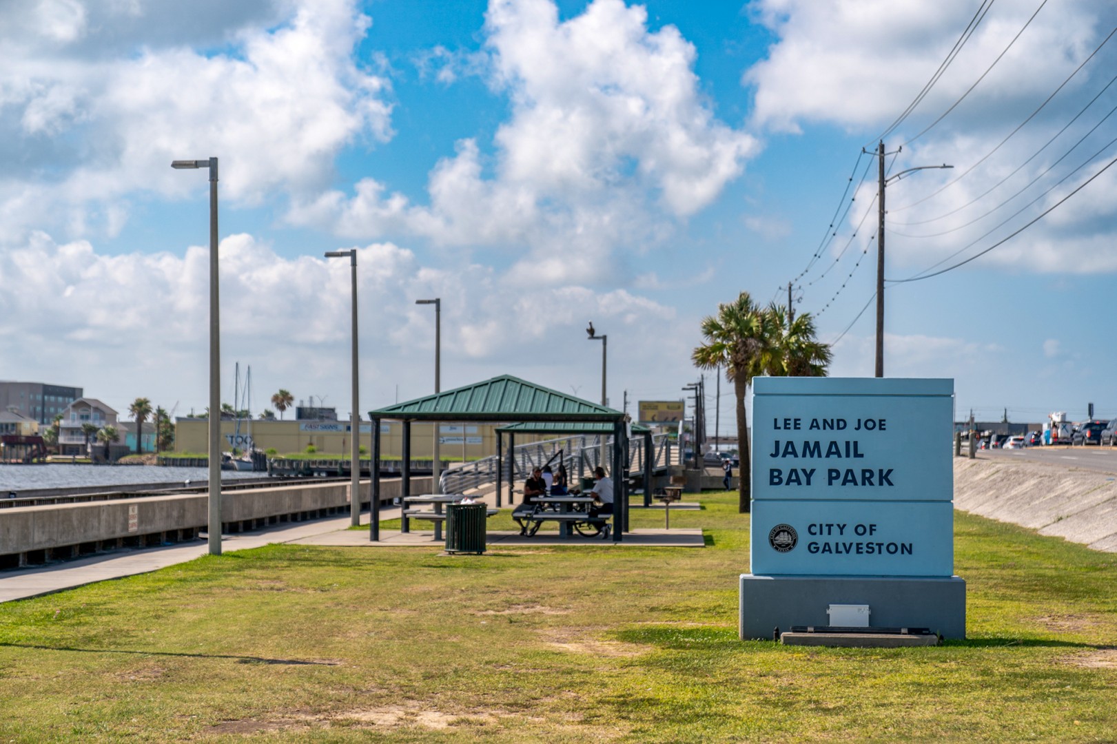Amenities at Lee and Joe Jamail Bay Park include a boat ramp on the north side of the bridge with truck/trailer parking spots, a park on the south side and a steel pedestrian bridge connecting them. It also includes a parking lot with 23 spaces, two new fishing piers, landscaping and three new pavilions with picnic tables.