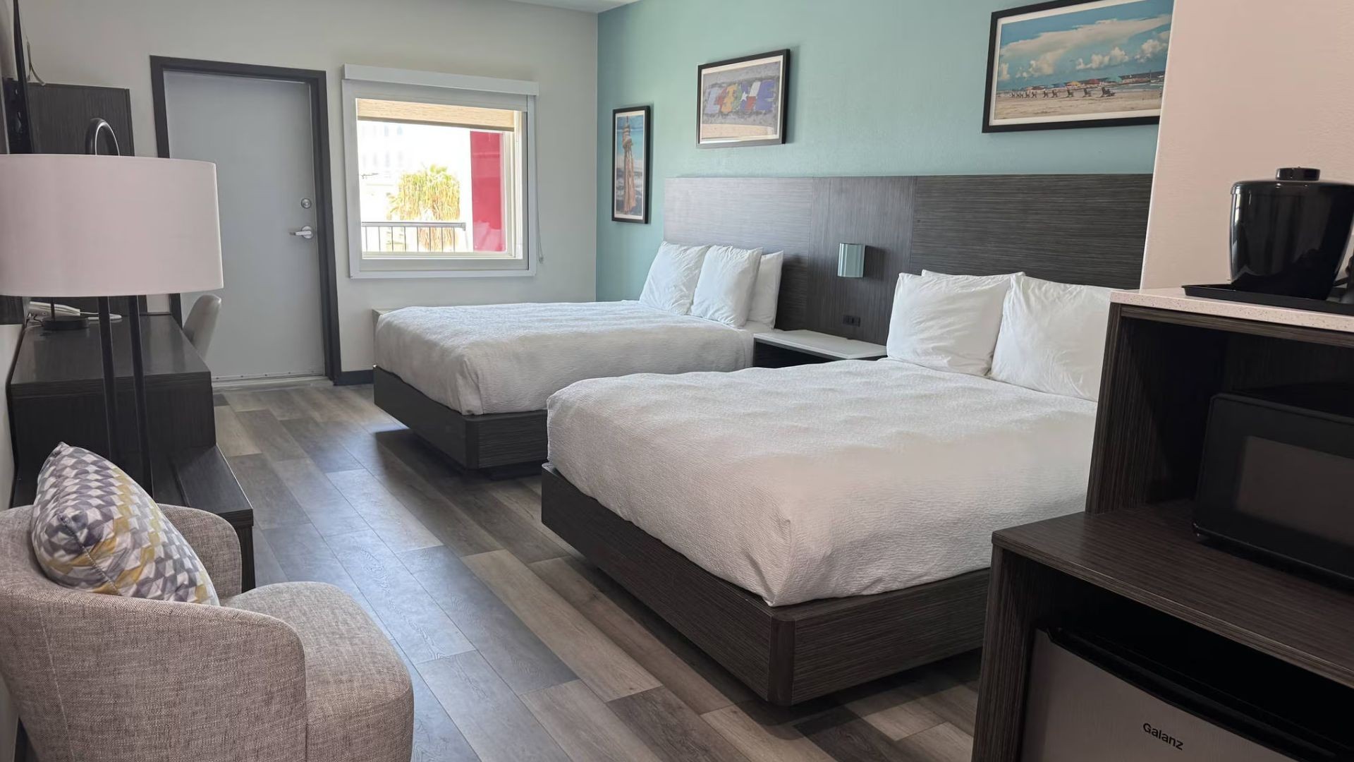 Guest rooms are thoughtfully equipped with modern comforts, including flat-screen TVs and high-speed WiFi. Select rooms offer private balconies or ocean views, adding an extra touch to a coastal getaway. With free parking, a shuttle service to local attractions, and a convenient grab-and-go market, Seabreeze Hotel provides an easy and enjoyable stay on Galveston Island.