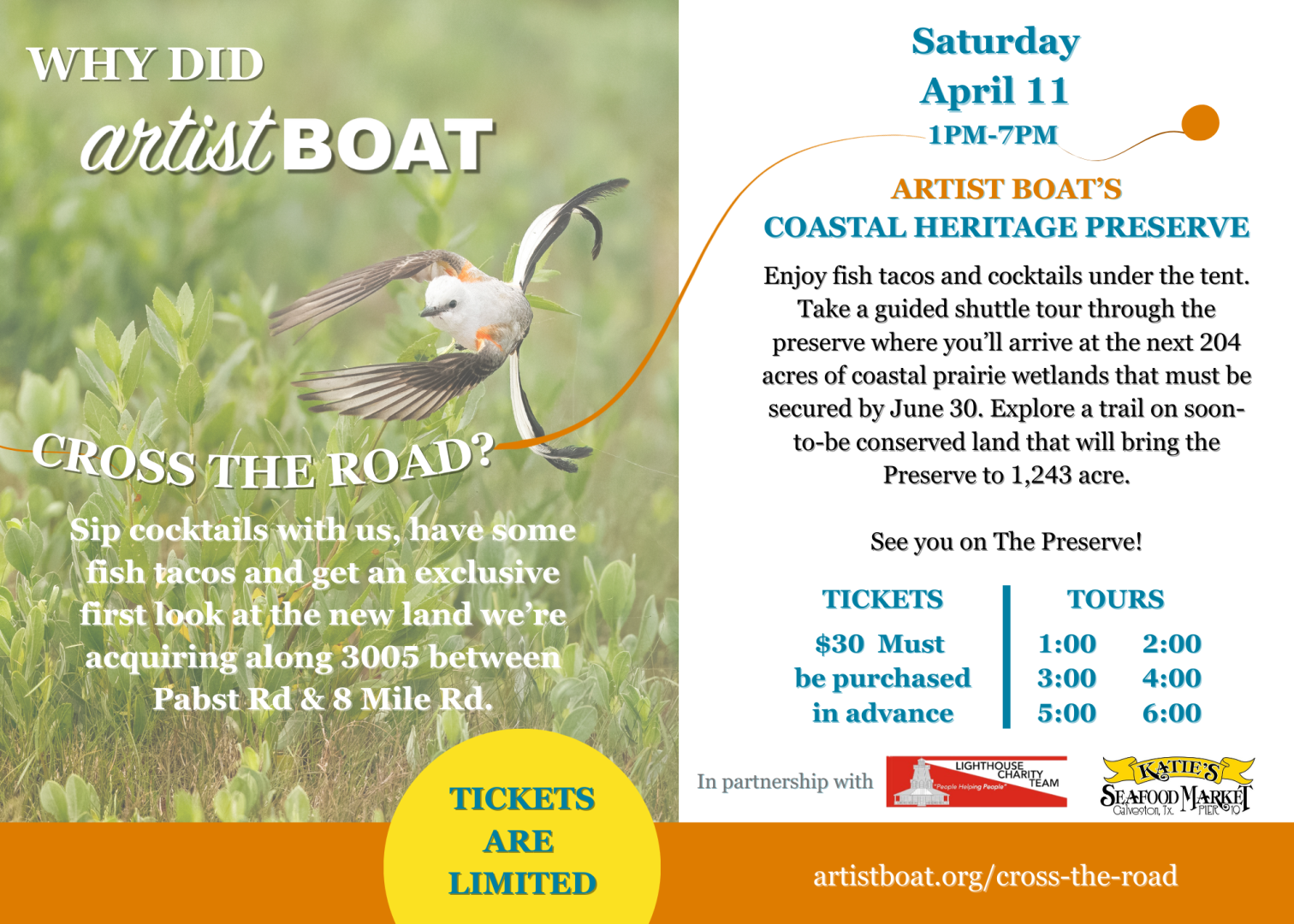 Come explore the soon-to-be conserved land and trails! Enjoy a shuttle bus tour at 1:00 pm, 2:00 pm, 3:00 pm, 4:00 pm, 5:00 pm or 6:00 pm through the Coastal Heritage Preserve, where you will arrive at the next 204 acres of coastal prairie and wetlands that must be secured by June 30.
