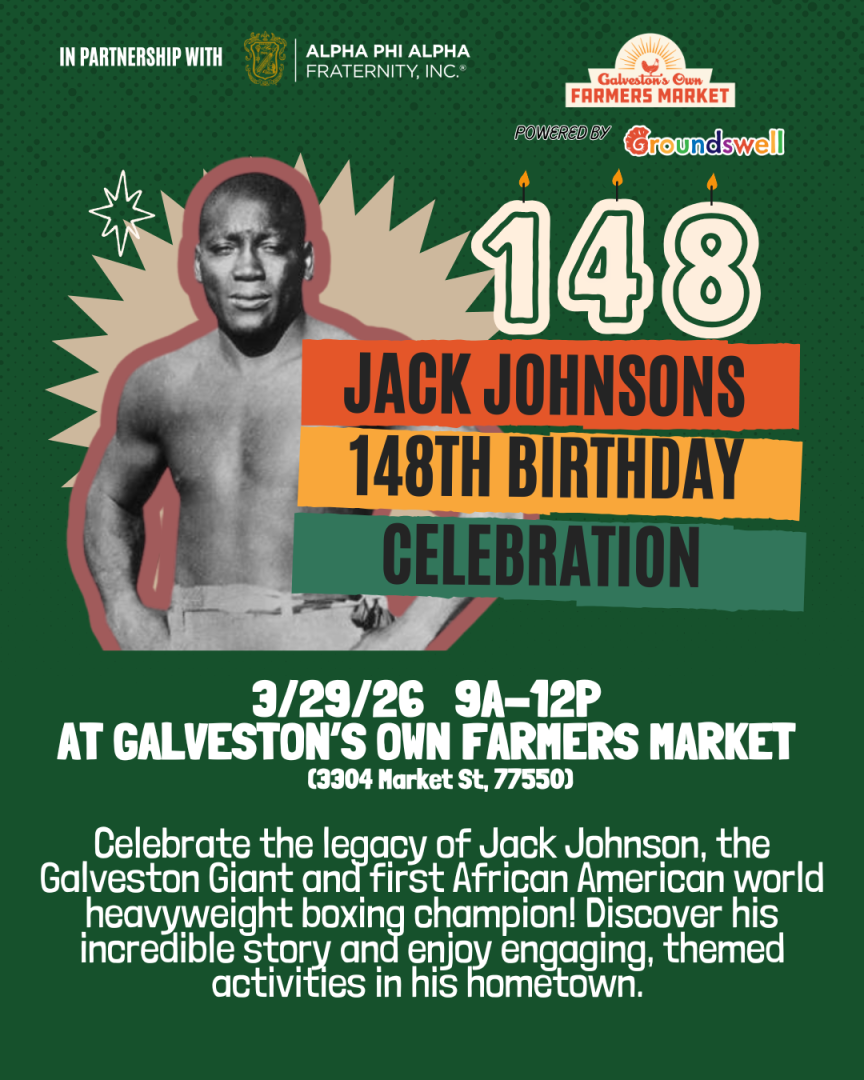 Celebrate the legacy of Jack Johnson, the first African American Heavyweight Champion and proud native of Galveston, at Galveston’s Own Farmers Market.