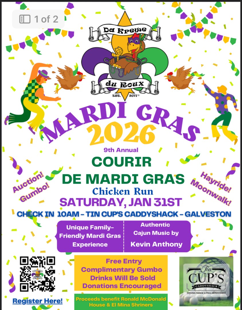 Da Krewe du Roux presents our twist on a Mardi Gras Chicken Run in Galveston! Bring the whole family to have fun while helping us give back to the community. We will be raising money for El Mina Shriners and the Ronald McDonald House of Galveston.