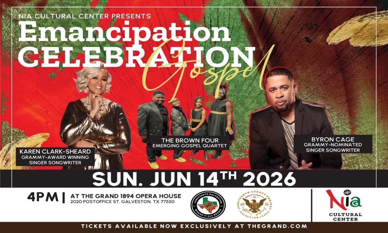 Come join the NIA Cultural Center for the 5th Annual Emancipation Gospel Celebration Concert featuring Four-time GRAMMY® Award-winner and multiple Stellar and GMA Dove Award winner Karen Clark Sheard at the historic 1894 Grand Opera House in Galveston, Texas, the birthplace of Juneteenth.