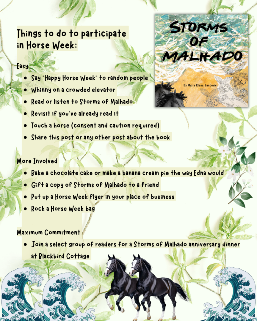 Each year, on the last week of March, on Galveston Island, we celebrate the survival of two brave and remarkable horses. During the Great Storm of 1900, two noble equines climbed upstairs in a Broadway mansion and viewed the wreckage from one of the windows. After the storm, they refused to come down, but the family fed them, cared for them, and they lived out their days in plush opulence. This story, purely fictional, makes a cameo in Storms of Malhado, a historical novel set on Galveston Island written by Maria Elena Sandovici. Storms of Malhado was published in 2020, during lockdown, and the last week of March. Horse Week actually celebrates the anniversary of the book. In choosing to focus on the two horses, and in calling this celebration Horse Week, we are choosing to underscore the idea that lies at the very core of the book: The novel is a love letter to Galveston Island itself, an ode to its resilience, its survival, but also its mystery and unique combination of glamorous and scrappy.