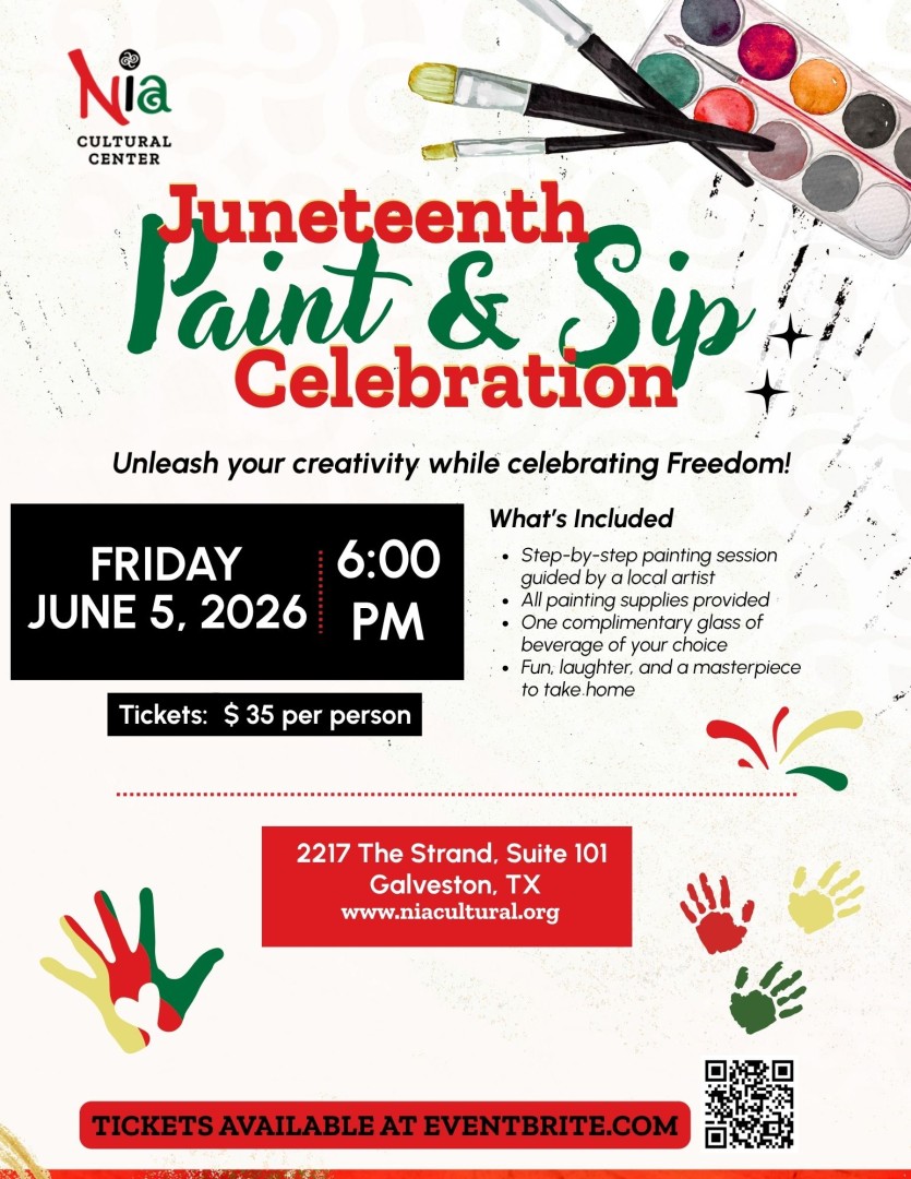 Join us for a fun and relaxed evening at the Nia Cultural Center on June 5, 2026, at 6:00 PM (Central Time). Unleash your creativity while sipping your favorite drink and celebrating Juneteenth with friends old and new. No experience needed—just bring your good vibes and get ready to paint, sip, and enjoy great company. Don’t miss out on this awesome in-person event!