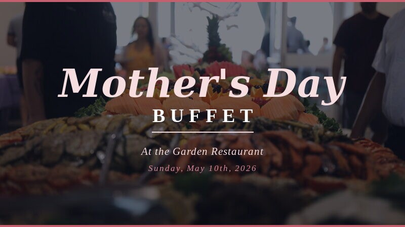 Celebrate Mom with a special Mother's Day Buffet at the Garden Restaurant on Sunday, May 10th. Enjoy a spread featuring Shrimp Gumbo, Fresh Garden Pesto, Chilled Seafood Pasta, Lemon Pepper Snapper, Chicken Gruyere, Lobster Ravioli, Roast of Ribeye, and more — plus a Kid's Station and dessert table with cakes, cookies, and miniature bites.