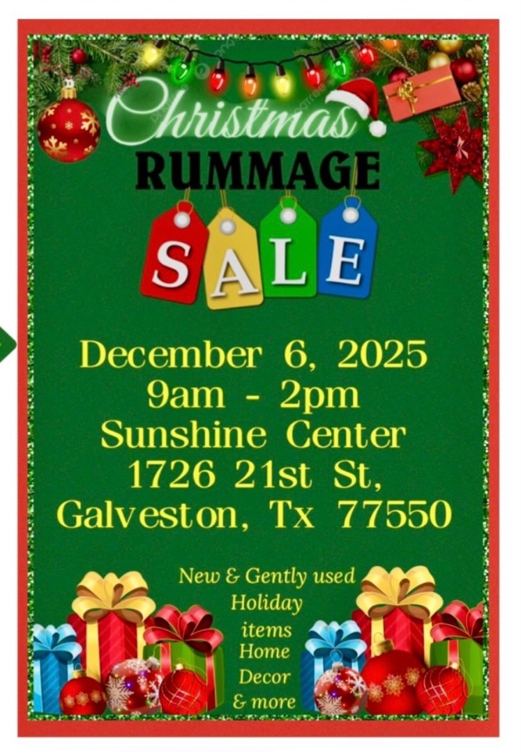 Sunshine Center Annual Christmas Rummage Sale happens Saturday, December 6th 9am to 2pm. Great deals on gently used Christmas decor, handmade wreaths and much more. 100% of the proceeds go back to the center that works with adults with developmental delays. We are rain or shine. (inside if raining). Please stop by 1726 21st, Galveston, Texas 77550.