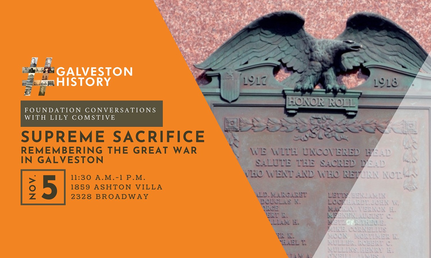 Join public historian Lily Comstive as she explores Galveston’s deep connections to World War I and the ways the island community chose to honor its fallen. In her lecture, “Supreme Sacrifice: Remembering the Great War in Galveston, Texas,” Lily will discuss the history and meaning of the city’s memorial efforts—including the Honor Roll Monument along the Seawall, the Memorial Oak plaques once lining Broadway, and the 2018 historical marker at the University of Texas Medical Branch campus.