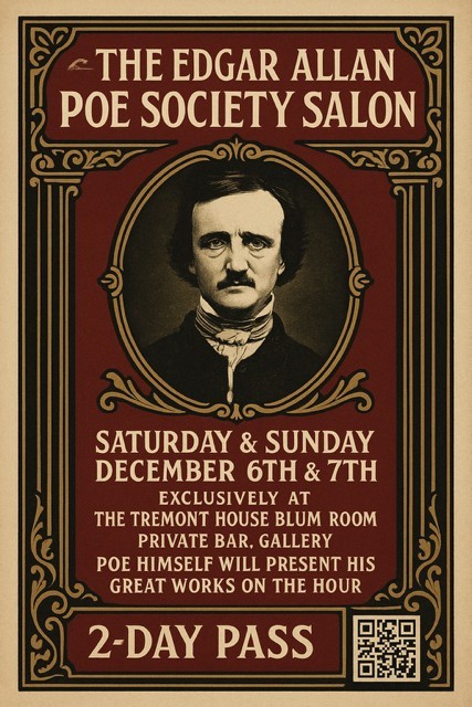 December 6th & 7th (Saturday, Sunday), I shall take up residence at The Tremont House during the Dickens on the Strand Weekend, where I have secured private rooms for The Edgar Allan Poe Society Salon.