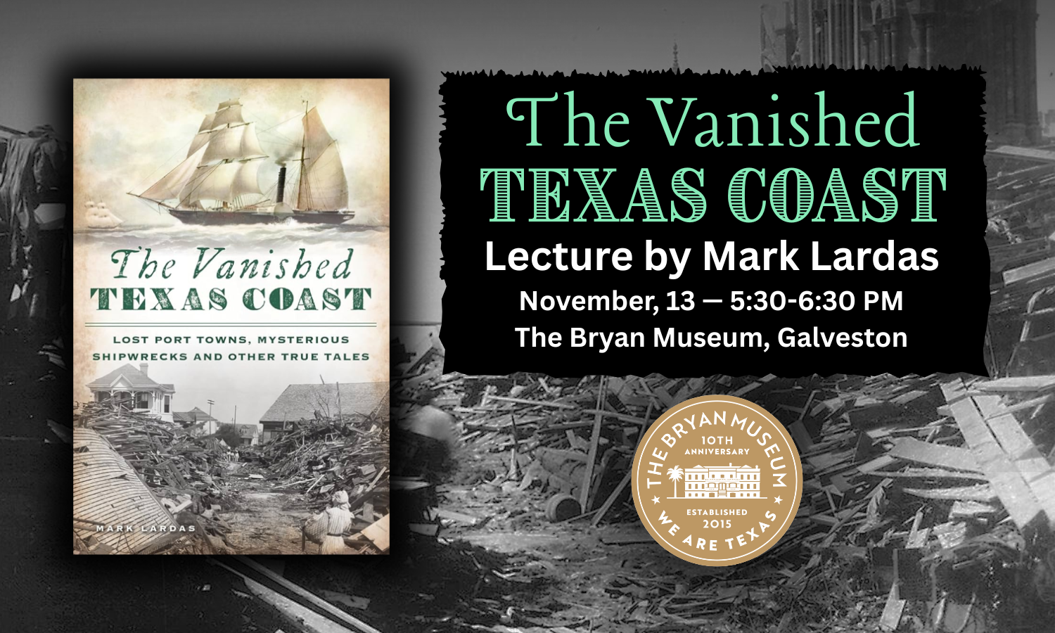People associate Texas with cowboys and cattle, cotton and oil. Today, Texas is high-tech: the Telecom Corridor in Dallas, computers in Austin, NASA in Houston. Many think of Texas as a product of its land. Yet Texas has always been influenced by the sea. For 350 years, the sea carried Texas history. It brought explorers, castaways, pirates, empresarios, immigrants and cargoes. It carried away Texas’s agricultural goods, bringing wealth to the state. Before the railroad and telegraph, the sea was the quickest way to communicate with the state or for the state to communicate with the outside world. The sea made Texas what it is today, invisibly influencing Texas from its beginnings through the present. This talk, and the book The Vanished Texas Coast explore those connections.