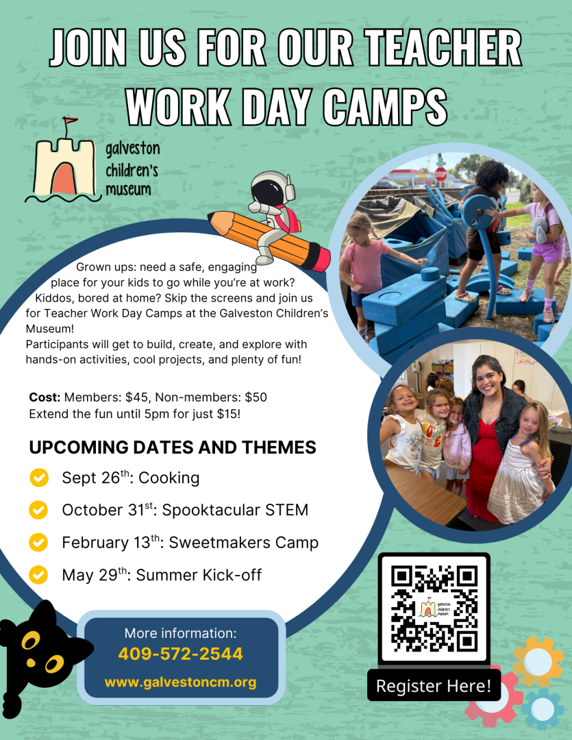 Grown ups: need a safe, engaging place for your kids to go while you’re at work or at an event? Kiddos, bored at home? Skip the screens and join us for our day camp at the Galveston Children’s Museum!