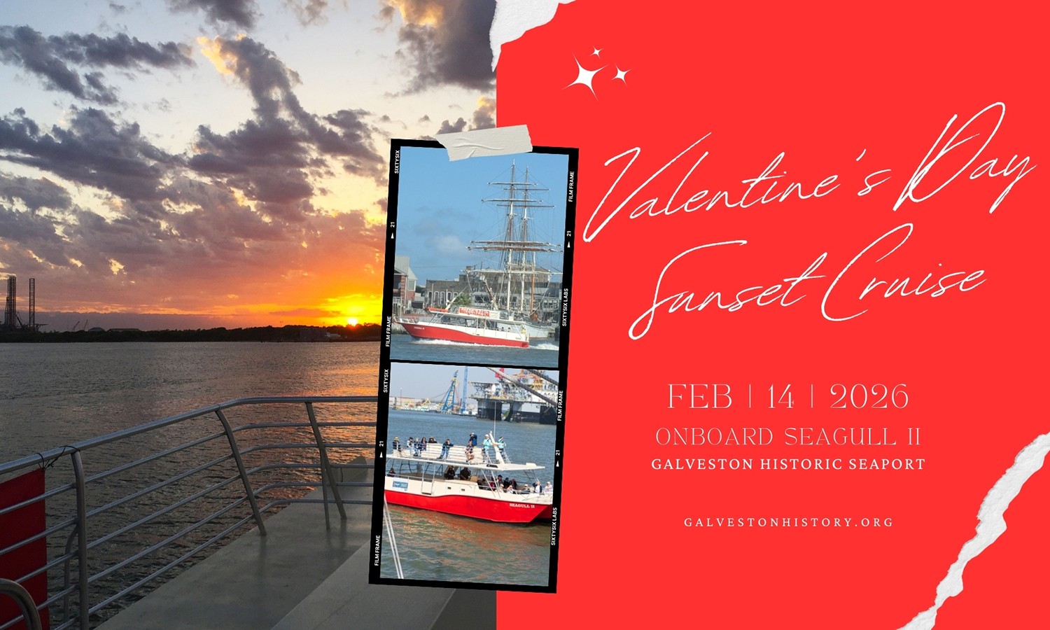 Enjoy a picturesque Valentine’s Day sunset cruise aboard Seagull II, Galveston Historical Foundation’s 50-foot twin-engine motor vessel. Fast, stable, and sheltered, she was built specifically for harbor sight-seeing excursions and education and is a perfect platform for waterborne experiential learning. The boat is U.S. Coast Guard certified and her operators are fully licensed and knowledgeable about the history and lore of her home waters. Seagull II has a comfortable main deck, sheltered from sun and rain. An open upper deck affords a full panorama of water and sky.