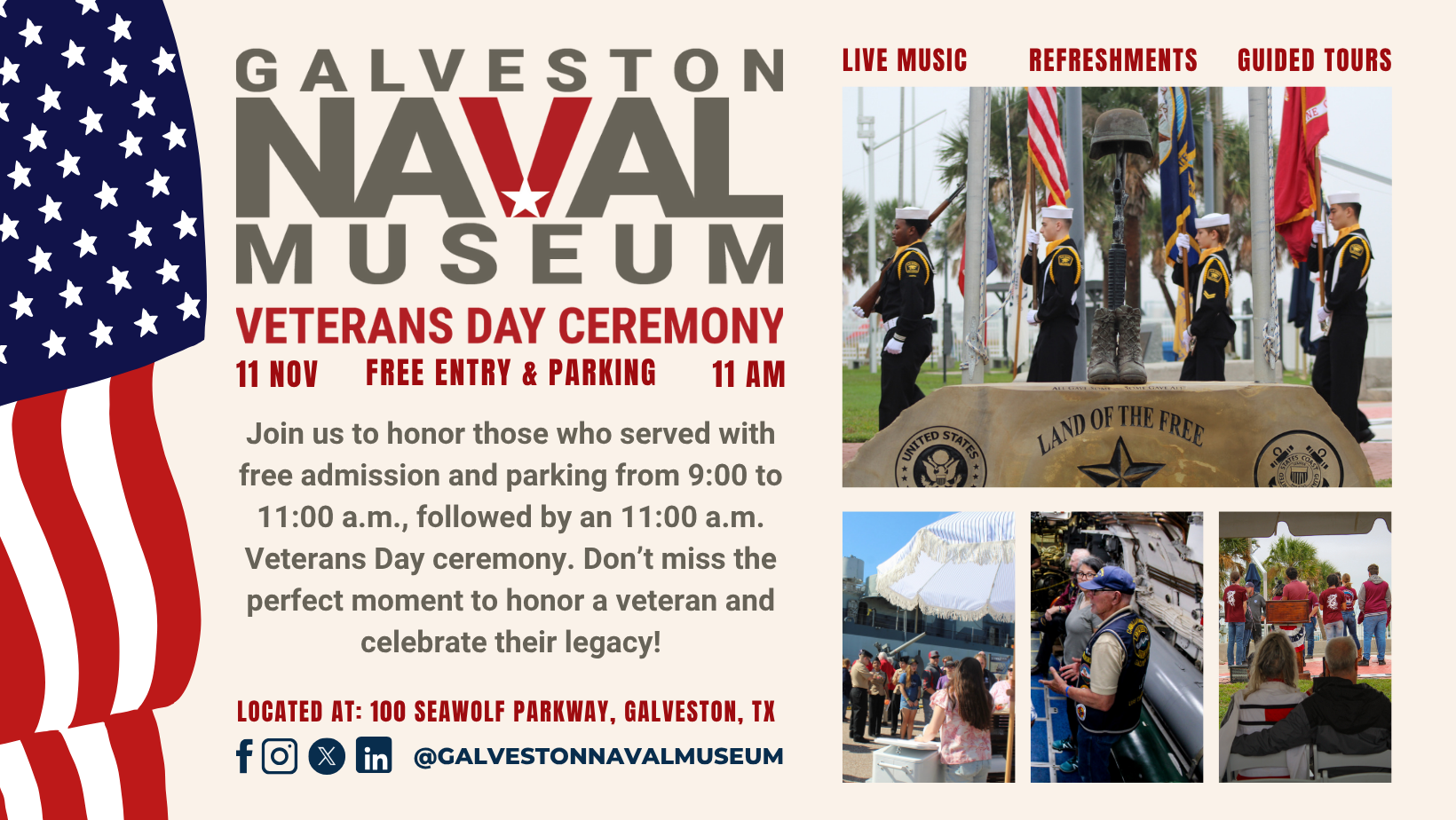 Join the Galveston Naval Museum for a free, public tribute this Veterans Day. It is a profound and patriotic gathering where our community comes together to honor the service, sacrifice, and legacy of our nation's brave veterans.