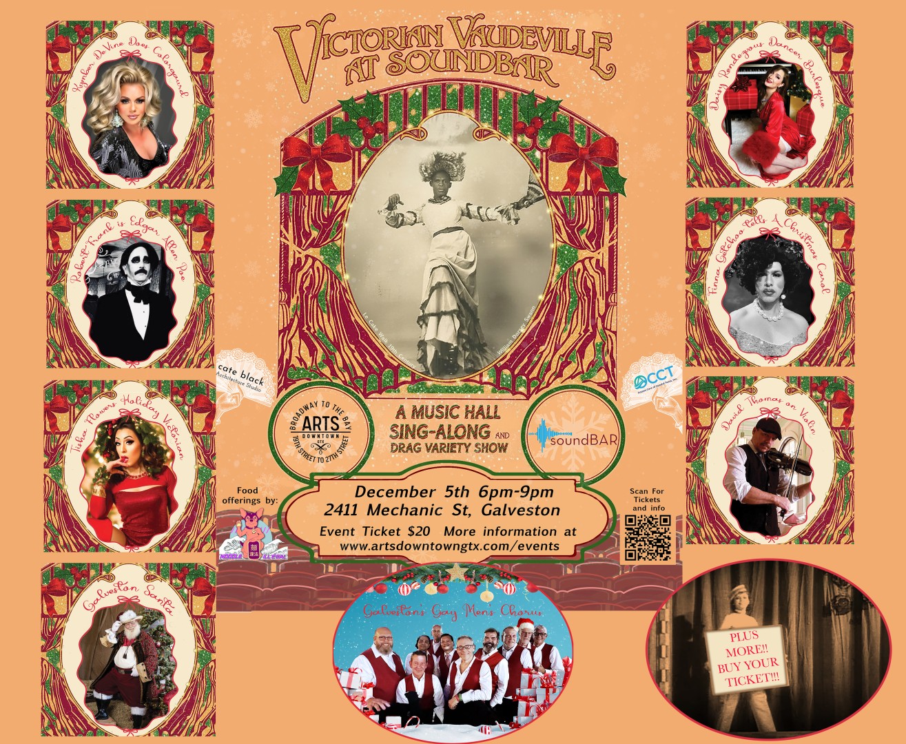 Join ARTS Downtown GTX and Soundbar for a jubilant kickoff to the Dickens Festival Weekend! Our radiant hosts will lead you through an evening of festivities beginning at 6:15pm with a performance by Galveston's Gay Men's Chorus, followed by a variety of acts in fabulous drag and a Music Hall style sing-along to spark your festive spirit! The halls will be decked in splendor, summoning the magic of the season! Noodle Ill e’ Gal will also be there serving up delicious dishes.