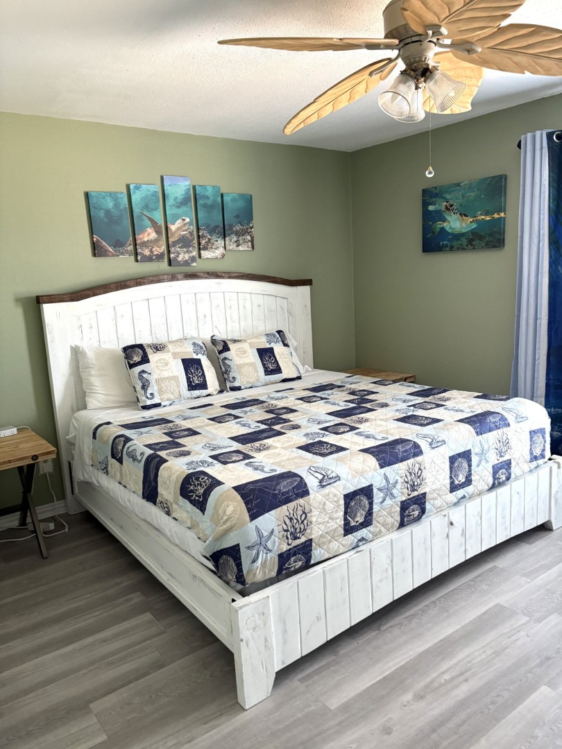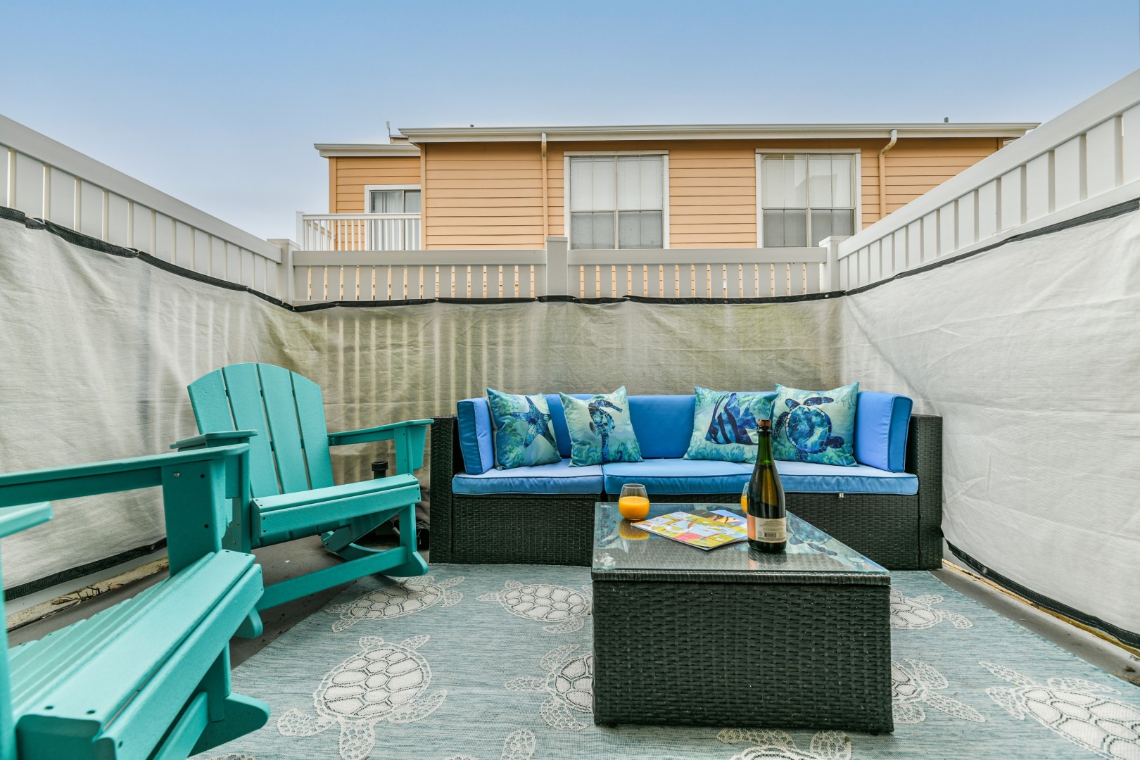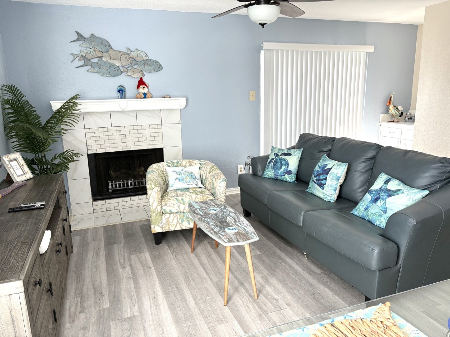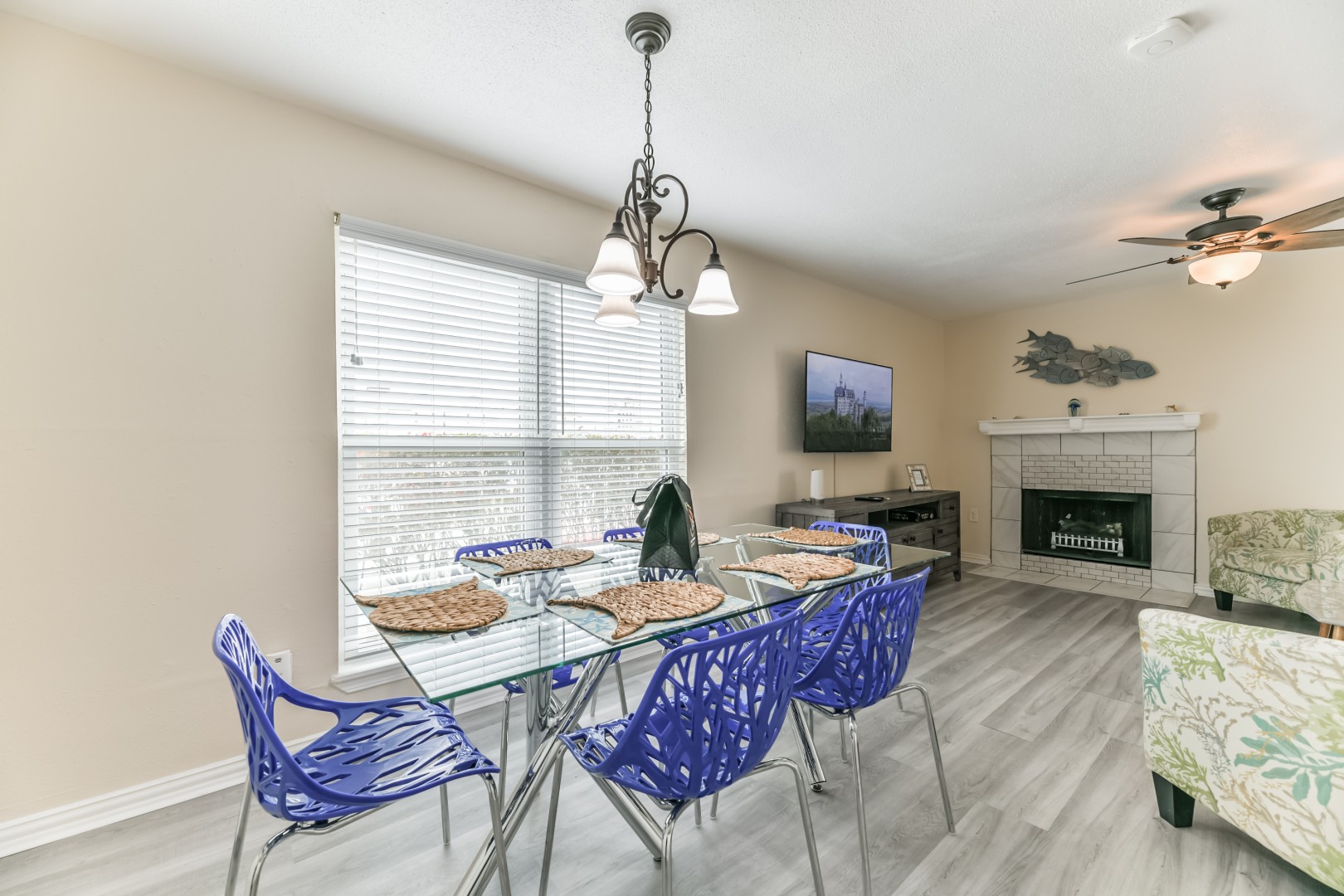Reserve Your Stay Today at Gone Coastal! A dog friendly 2 BR/1 BA condo located at The Palms at Cove View. When you are ready to enjoy the coastal life, come be our guest at Gone Coastal. This great condo is decorated to bring that coastal theme to you. This unit is great for snowbirds as well with a fireplace in the living area. Check out the photos to see the close proximity to the beach. Vibrant colors accent the living, dining and kitchen. Relax on the couch which makes into a futon style bed or the two cozy chairs to watch tv or enjoy a warm fire. There is also a wet bar to end your night with a cocktail. The dining area has seating for 6 and boasts great Caribbean blue chairs to add to the coastal vibe. The kitchen is fully stocked with colorful cookware, plates and utensils. You'll have everything you need to cook your catch of the day. A full size, stackable washer and dryer is also located in the kitchen for guest use. When you're ready to call it a night, ascend the stairway to one of two bedrooms both with a wall-mounted tv. The primary bedroom has a king size bed and adjoins the full size bathroom which offers a tub/shower combination. The second bedroom is great for adults or kids with a twin over full bunk bed. There is also a great reading nook filled with toys for the kids. You can enjoy the outdoors at the unit either on the private patio area or in the complex pool area. This unique unit also has an attached garage that is stocked with beach toys and chairs for your use. There is a $150 fee if the garage door opener is lost. There may be some variations in furnishings or decor since pictures were taken. This property is convenient to any of Galveston's area attractions. Schlitterbahn Water Park, Moody Gardens, Moody Gardens Golf Course, putt-putt, fishing and the beach are all within a short walk or drive. You can also head east to do a little shopping in the Downtown Strand Historic District, visit art galleries, museums, or take in a live performance at The Grand 1894 Opera House or the East End Theatre Company. Numerous local restaurants offer various culinary delights and you are sure to find something tasty at almost every price point.