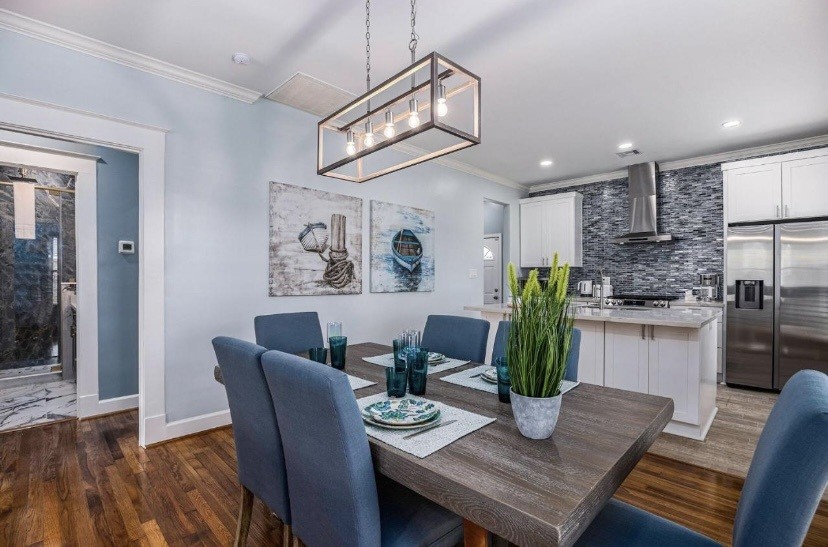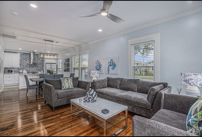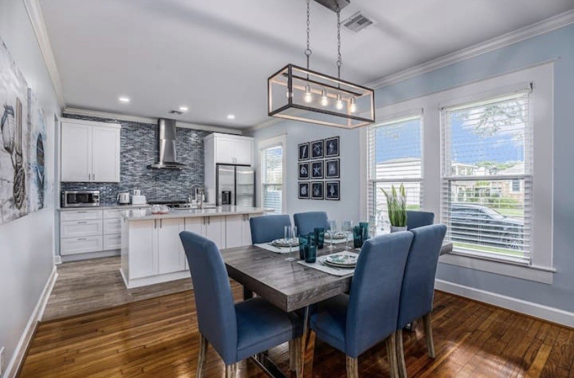 Discover your ideal vacation at this stunning, brand-new Galveston villa with an Excellent Booking rating. A seamless blend of modern design and alluring comfort, the home is fully equipped for a luxurious stay. With a spacious, open-plan living area overlooking the charming neighborhood, you'll have a bright and airy space to relax. This prime Midtown location places you moments from both the serene beach and the bustling downtown scene. Inside, find premium comfort with a king-size and a queen-size bedroom, plus a comfy queen sleeper sofa. Outside, a large garden with a BBQ and sitting area awaits.
