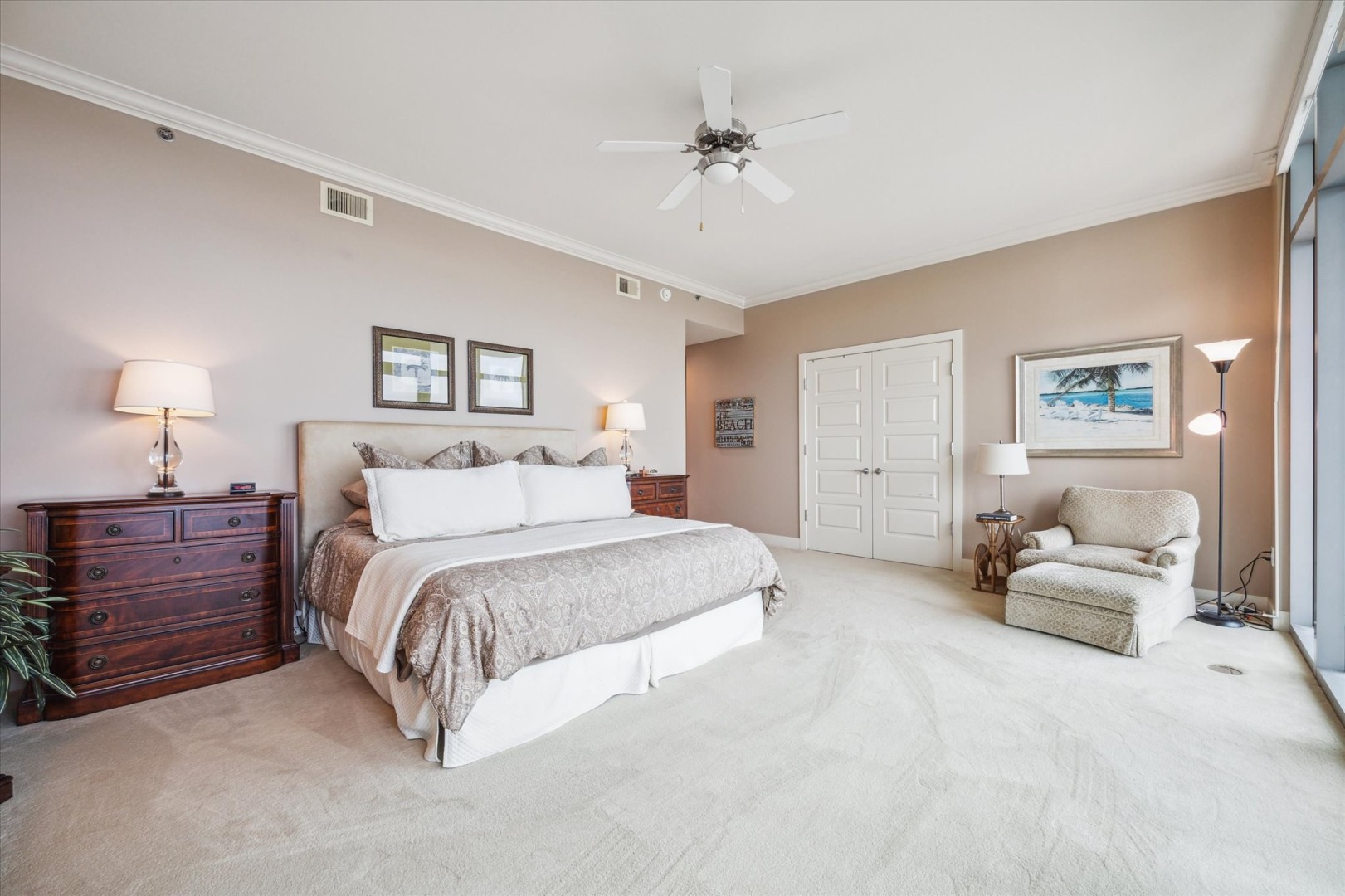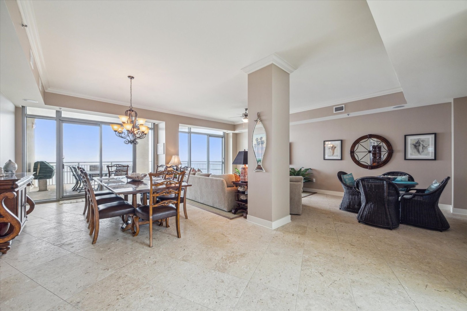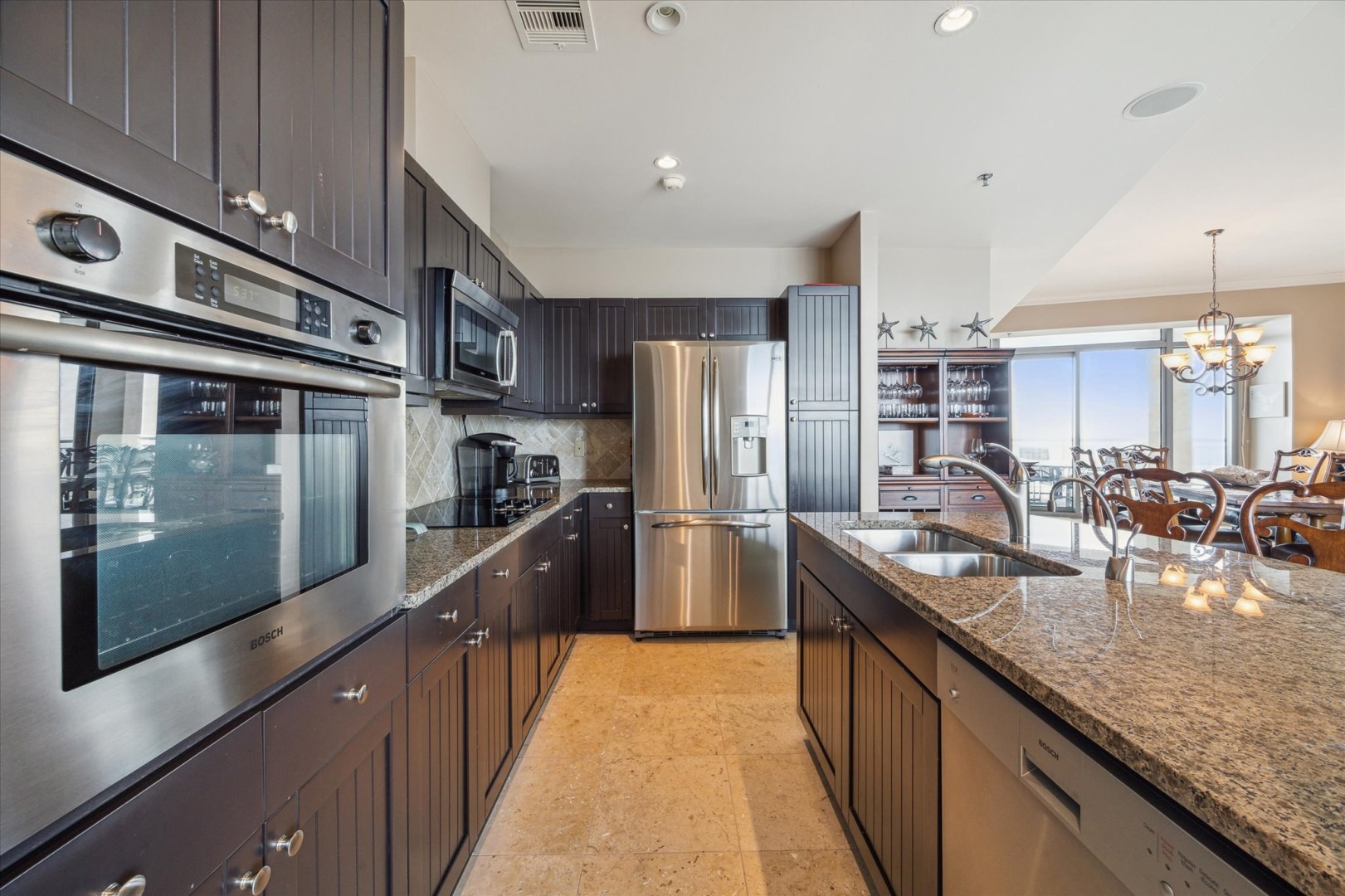 Discover breathtaking sunset views from this stunning 23rd-floor Signature unit complete with soaring 10 ft ceilings. This oceanfront retreat invites the whole family to enjoy the beauty of beach life featuring 3 balconies! The striking decor and multiple seating areas create an inviting atmosphere for ultimate relaxation. Flooded with natural light from floor-to-ceiling windows and featuring two balconies, the large living room offers breathtaking views of the beach and ocean on one side, and the bay and wetlands on the other. The fully equipped kitchen is outfitted with stainless steel appliances and all the necessary cookware to satisfy any culinary desire, from quick snacks to elaborate meals. Step out onto the beachfront balcony to find a built-in stainless-steel grill along with ample space for al fresco dining. For more casual meals, you can sit at the breakfast bar that accommodates three or gather around the dining table that seats eight comfortably. All TVs in this unit are Smart TVs, providing easy access to your favorite streaming services! In the primary bedroom, relax in a luxurious king-size bed while enjoying your private balcony and stunning views. The en suite bathroom features dual sinks, a soothing tub, and a glass walk-in shower. The second bedroom also includes a king-size bed and its own TV along with an en suite bath complete with a walk-in shower. The third bedroom is perfect for kids or extra guests, featuring two sets of twin-size bunk beds; they’ll have convenient access to an adjacent full bath. Bring everyone along for an unforgettable stay in this remarkable unit!
