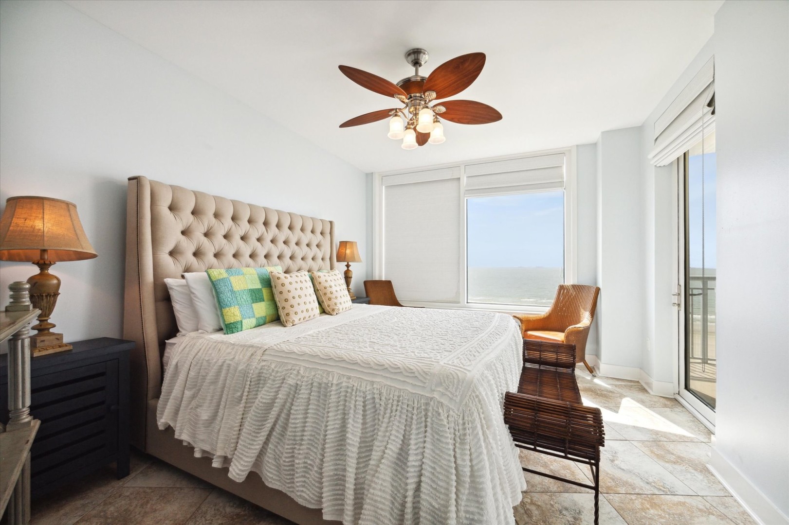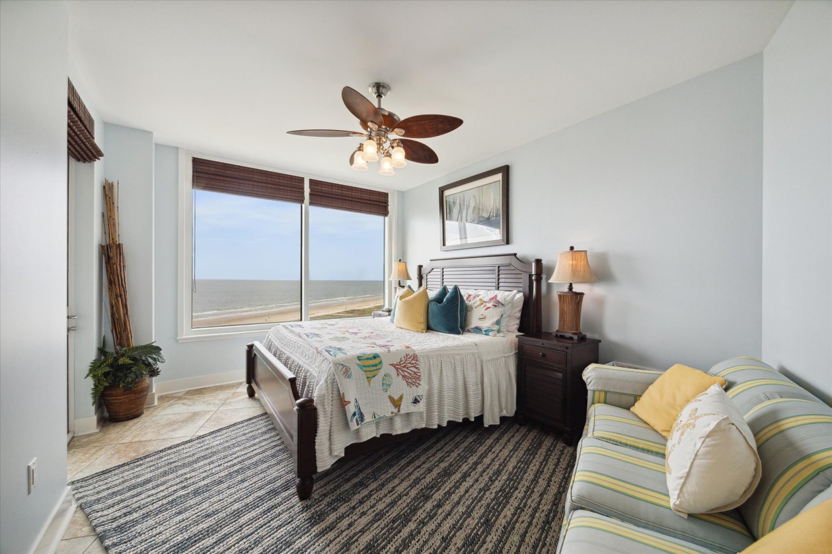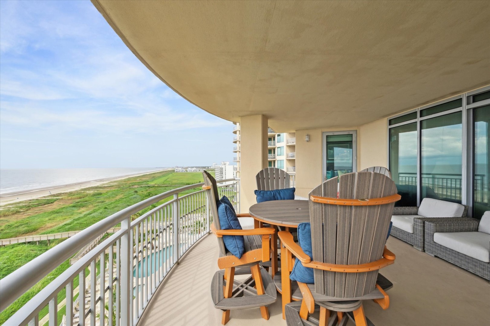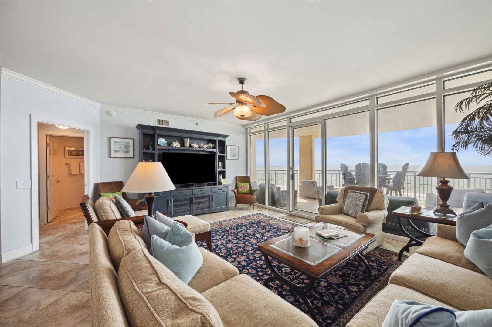Escape to the Beach in this 3 bedroom, 3 bath condo situated with South, East and West views of the Gulf from your large balcony! Offers a relaxing beach getaway with the soothing sounds of ocean waves. This well-sized condo features a spacious kitchen, dining area for six, and a breakfast bar for two. Equipped with stainless steel appliances, a bar area, and all essentials for meal prep. Living room has floor to ceiling windows and balcony access to enjoy the amazing view of the waves, palms and sand. Sit back and watch a movie after a long day of water fun with a large flat screen TV while you veg out on the oversized comfy couch. In the Primary suite, you'll find a luxurious King bed, a private en-suite bath, and flat-screen TV, perfect for unwinding after a day of sun and sand. Also has access to the balcony to step out in the morning feeling refreshed and ready for the day. Secondary bedroom offers King size bed, en-suite bath with shower/tub combo and balcony access. Third bedroom features bunk beds, a large-screen TV, and easy access to the nearby third bathroom. Note: no door. Bringing a little one? There is a full crib available in the master walk-in closet. Guest must bring their own sheets/linens. Want to hear the waves while you have dinner, no problem! This condo offers 452sf of balcony with endless views and plenty of seating for everyone!