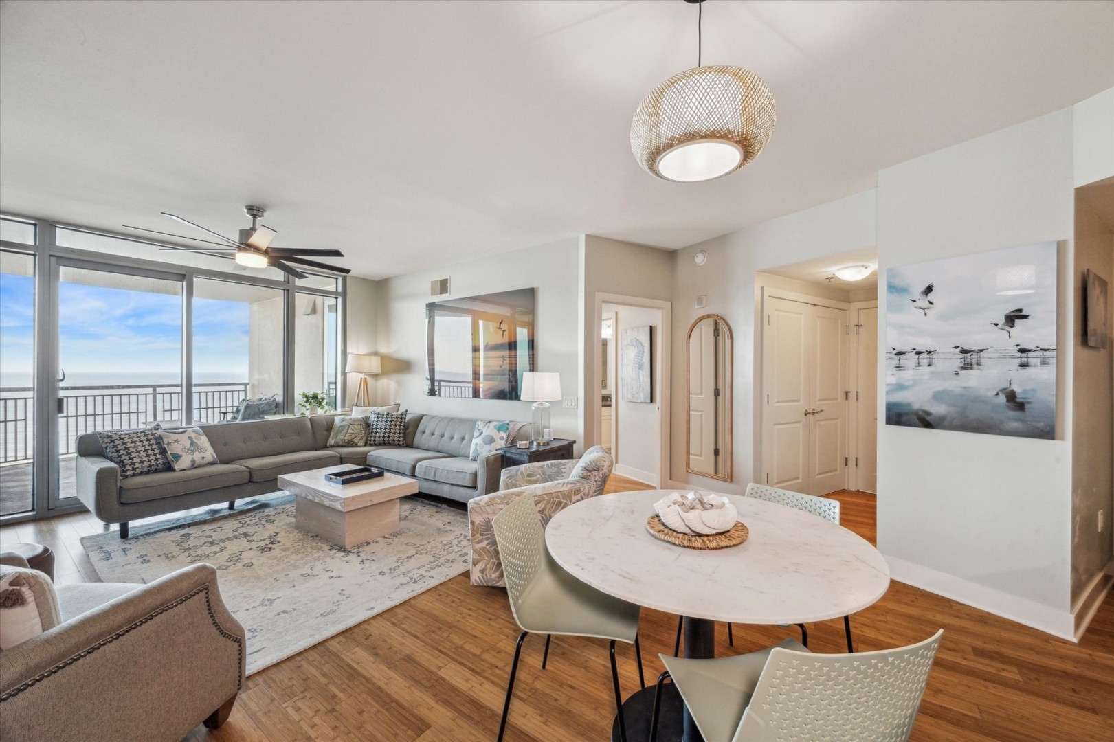 Welcome to Palisade Palms, where your idyllic vacation begins on an East-facing balcony that promises enchanting mornings. Picture yourself savoring a freshly brewed cup of coffee as you witness boats gracefully gliding across the sparkling waters, while playful dolphins dance in the surf. The balcony offers an unparalleled vantage point to catch breathtaking sunrises over the sandy beaches, providing a backdrop for memories that will last a lifetime. Upon entering this stunning pet-friendly condo, you are immediately drawn to its open-concept design that seamlessly integrates stunning Gulf views. Floor-to-ceiling windows invite the beauty of the ocean indoors, creating a living space that is both airy and invigorating. The spacious living, dining, and kitchen areas form the heart of this seaside sanctuary, ideal for relaxing with loved ones and soaking in the picturesque surroundings. The balcony serves as a serene retreat where you can enjoy leisurely meals or unwind in comfortable seating, all while the gentle ocean breeze envelops you. It is a perfect spot for both intimate gatherings and peaceful solitude, enhancing your overall vacation experience. Culinary enthusiasts will appreciate the well-appointed kitchen, complete with modern stainless steel appliances and elegant granite countertops. This space is designed for effortless meal preparation and quick snacks, allowing you to indulge in delicious dining experiences without the hassle. Accommodating families or groups of friends is a priority at Palisade Palms, thanks to its thoughtful split bedroom layout. In addition, the condo next door is in our rental program as well. Click the link to view this property Palisade Palms TW0906. The master bedroom features a luxurious King bed, a television for entertainment, and an upscale en suite bathroom. Here, you can unwind in a spacious 6-foot tub or freshen up at the double sinks, providing a private retreat for relaxation and personal pampering. On the opposite side of the condo, discover two additional cozy bedrooms. The second bedroom offers a comfortable Queen bed and its own en suite bathroom, while the third bedroom, featuring twin bunk beds and a trundle bed, serves as an inviting space for kids or additional guests. Although this room does not have a door, it is thoughtfully designed to foster a warm and inviting atmosphere. In summary, Palisade Palms is not just a place to stay; it is an experience that envelops you in tranquility, luxury, and the natural beauty of the Gulf. Whether lounging on the balcony or enjoying the vibrant surroundings, each moment promises to be memorable, making it the perfect getaway for you and your loved ones.