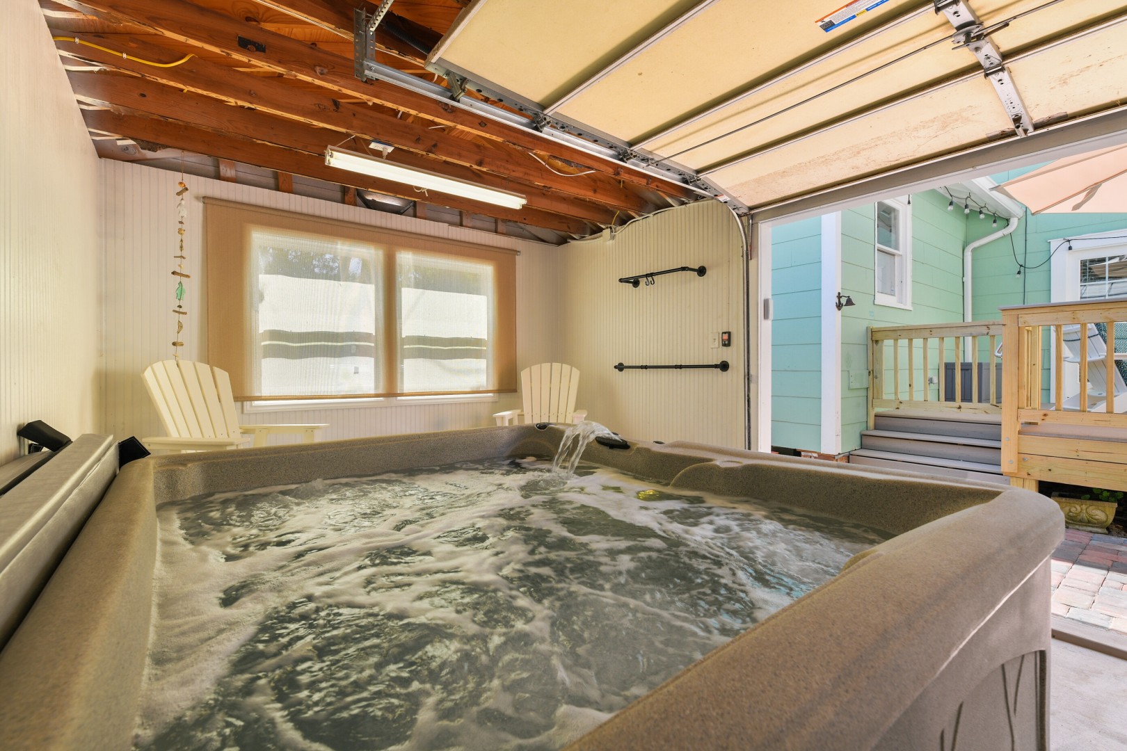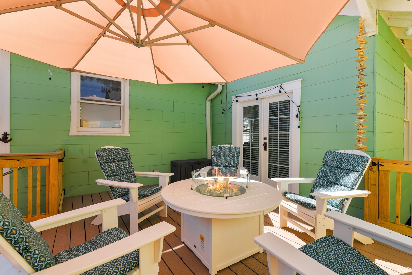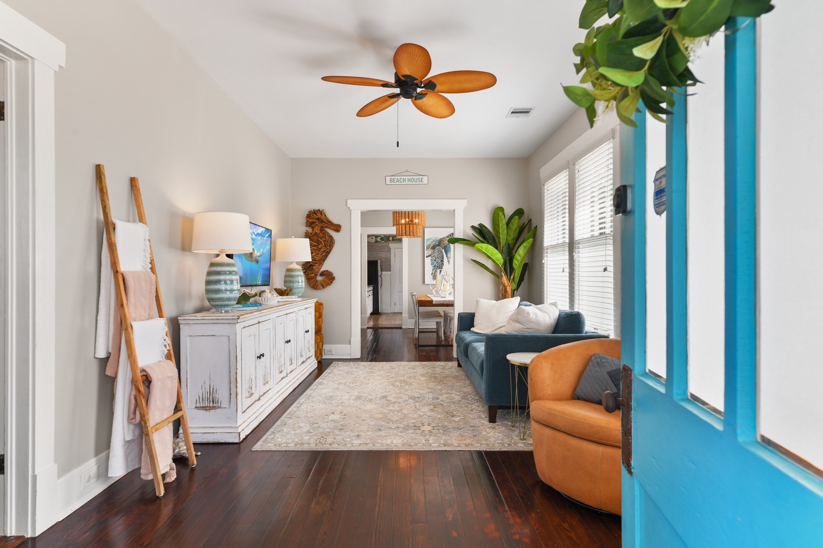 Relax with your family at this peaceful, historic, beach house built in 1914. Short walk to Beach, Pleasure Pier, The Spot & Blvd. Seafood restaurants! TWO BEDROOMS - BOTH KING BEDS - QUEEN SOFA BED - SLEEPS 5 Large deck off primary bedroom with tropical Banana Trees, Fire Pit & Adirondack chairs and Oversized Umbrella. String lights for evening ambiance. Private HOT TUB, Outdoor Shower with hot water Luxury Sheets BBQ pit BEACH GEAR provided (chairs, wagon, cooler w/ wheels, misc. beach toys, umbrella, beach towels). FULL & LOADED COFFEE BAR! Nespresso machine, drip coffee pot, pour over pot, frother, coffee pods, sugar, syrups. FULL KITCHEN w/ upscale amenities! ALL 5 STAR REVIEWS!