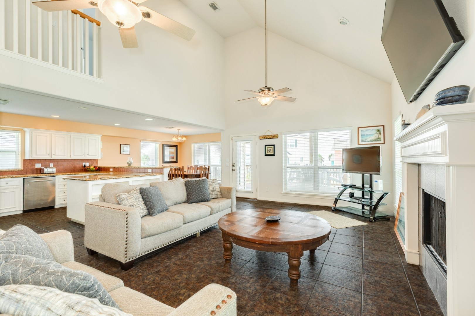 Step inside and you'll find vaulted ceilings, cool tile floors, a large TV, built-in shelving with board games and plenty of windows that make the living area both relaxing and fun-filled. The kitchen is fully equipped with stainless steel appliances, plenty of prep space for the family chef to whip up homecooked meals, and a breakfast bar with seating for four. Family meals are easy around the adjacent dining table.